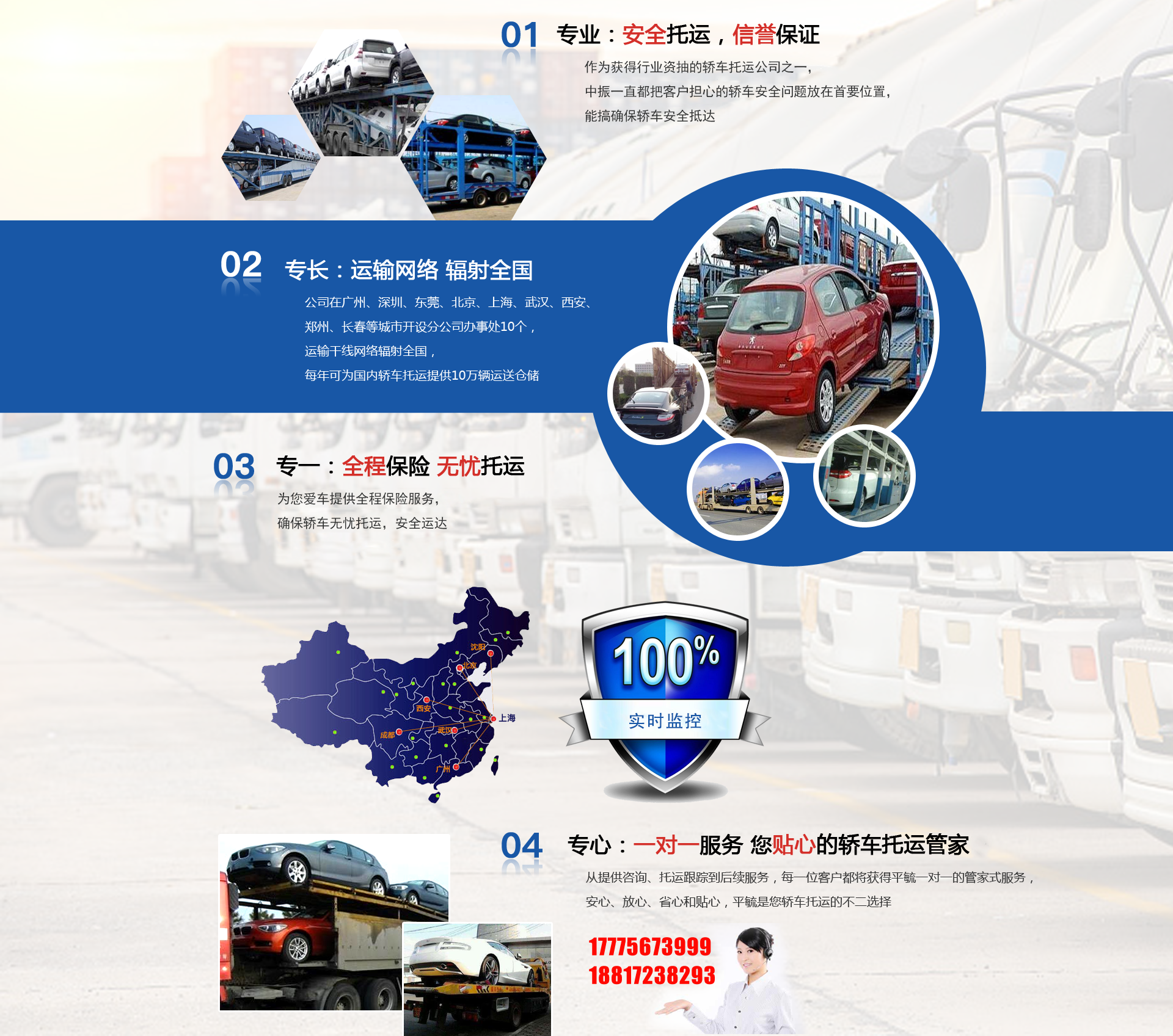 公司承諾:同等的價(jià)格,我們比速度,同等的速度,我們比服務(wù),同等的服務(wù),我們比誠信!公司全體員工牢記并且踐行著“尊客、愛車、守信、認(rèn)真、快速、價(jià)平”的服務(wù)理念,珍惜客戶給我們的每一份委托,用心處理轎車托運(yùn)的每個(gè)環(huán)節(jié),讓您的每一次所托都感到物超所值..... 了解更多